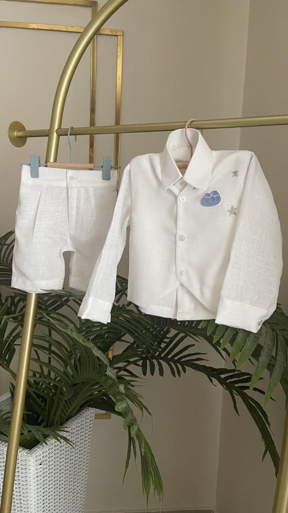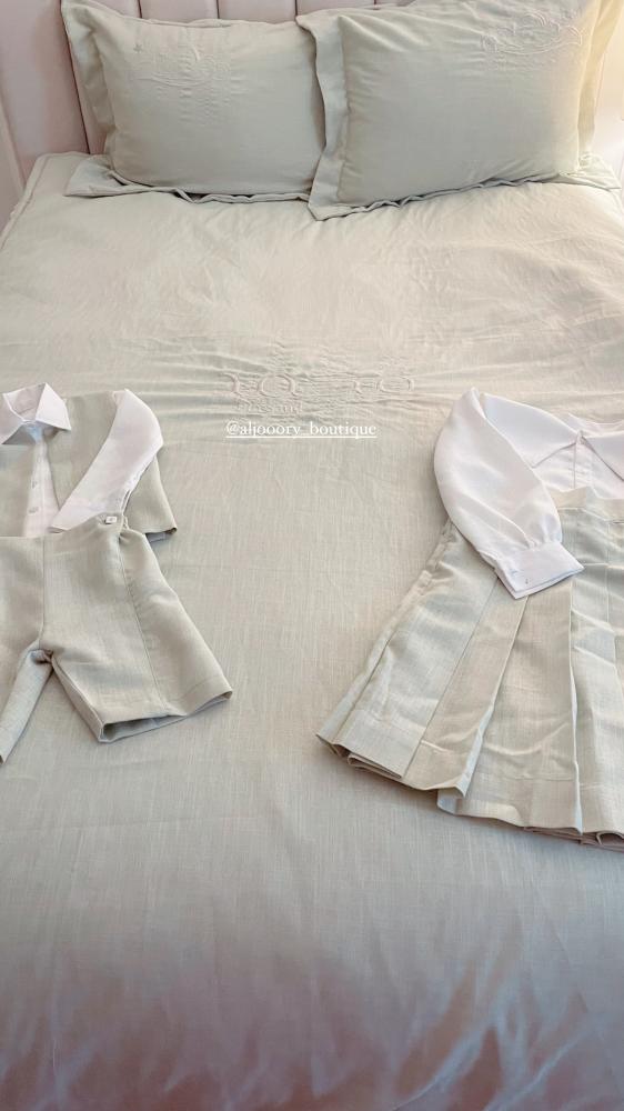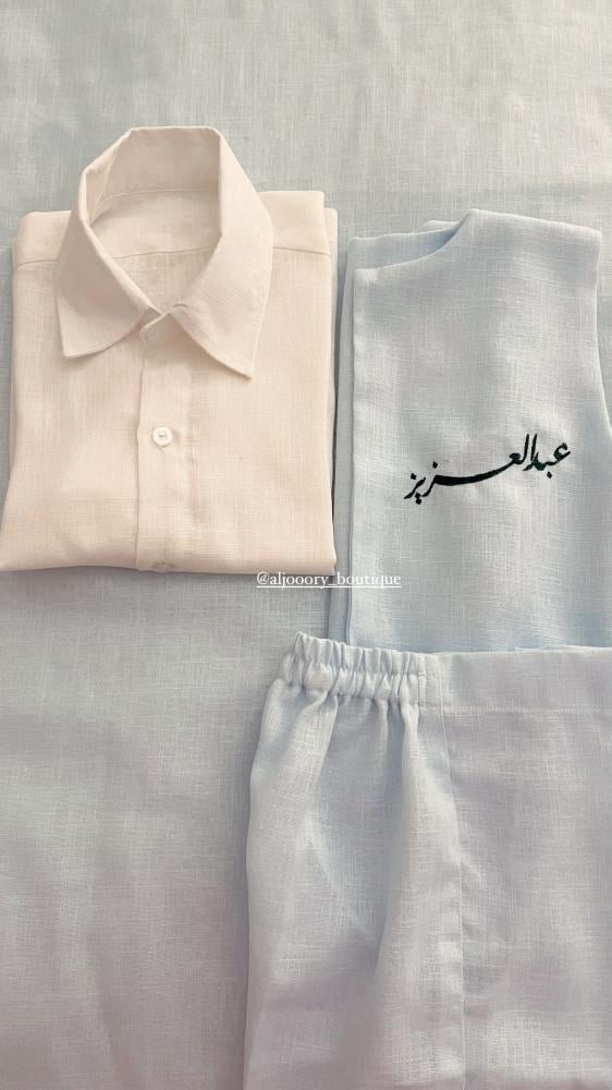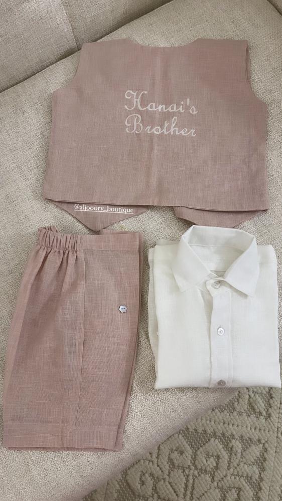 طقم اطفال بخامة اللينين يحتوي على :-قميصسديري ( جاكيت )شورت او بنطلونمع امكانية تطريز عبارة او الاسم على الجاكيت